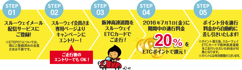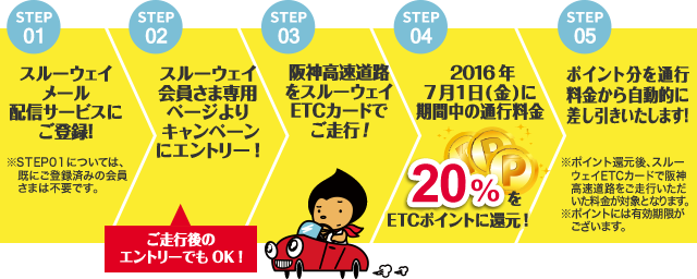 キャンペーン期間中にスルーウェイETCカードで阪神高速をご走行いただくと、